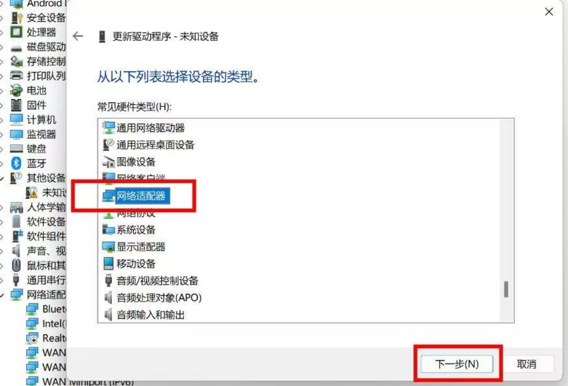 操作完后重新拔插棒子,等待棒子开机,观察设备管理器是否出现一个未知设备。出现了之后依次右键点击 > 更新驱动 > 浏览我的电脑... > 让我从计算机上... > 网络适配器 > 下一步 > 左边选择Microsoft >; 右边选择基于远程NDS的...,接着点击下一步根据提示确认