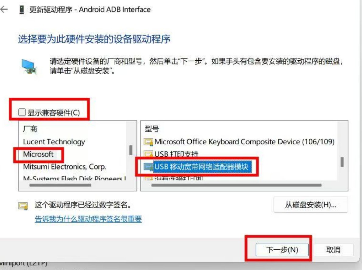 打开设备管理器,右键识别到的ADB设备,依次右键点击 > 更新驱动 > 浏览我的电脑... >; 让我从计算机上... > 取消勾选显示兼容硬件,接着可以跟我一样选择左边的Microsoft,再选择右边的这个USB移动宽带...,再点击下一步后根据提示确认