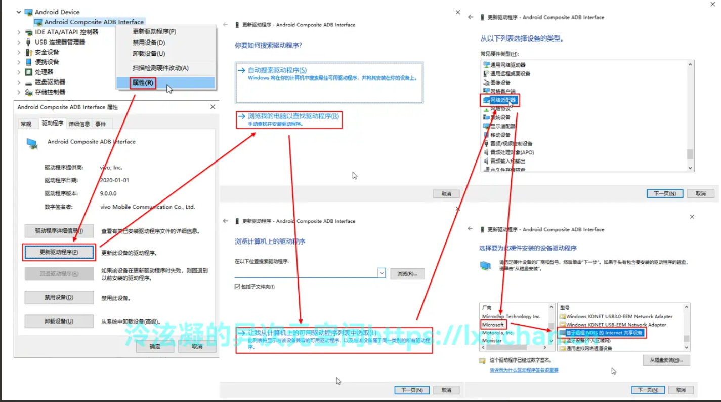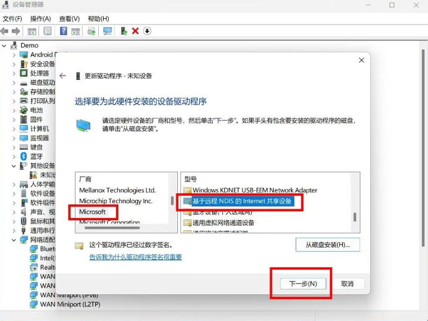 右键未知设备 更新驱动 选择 浏览我的计算机以查找驱动程序软件 让我从计算机上的可用驱动列表中选取 microsoft 基于远程rndis设备的usb共享