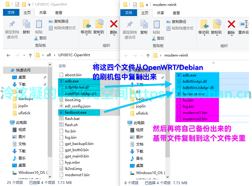 将前面提取的基带文件(4个,分别是modemst1.bin、modemst1.bin、fsc.bin和fsg.bin)与OpenWRT/Debian刷机包文件夹下的复制到一个新的文件夹内,然后在该文件夹空白处按住Shift+右键,选择“在此处打开PowerShell窗口”或“在此处打开命令提示符”。