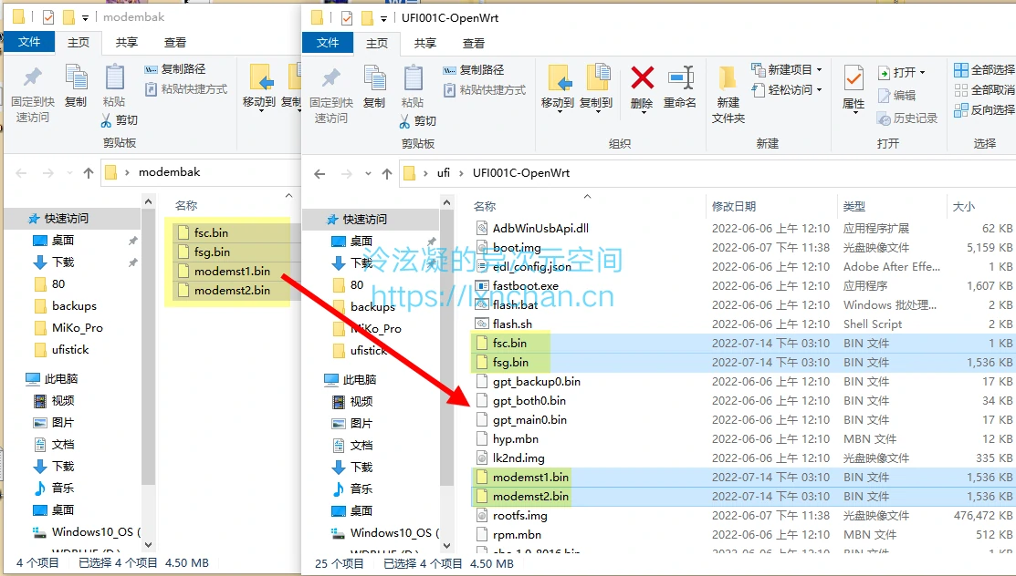 此时进入备份文件夹,找到这四个文件,将后缀名全都改为.bin,然后全部拖进之前准备好的OpenWRT文件夹或Debian文件夹中替换掉原来的文件即可。