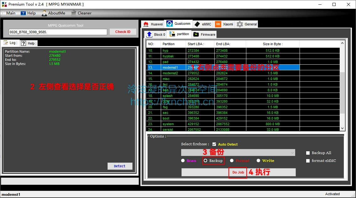 确认基带可用后,将棒子进入9008模式联机,打开Qualcomm Premium Tool,按照下图操作将modemst1、modemst1、fsc、fsg四个分区单独备份到一个文件夹中,一次只能备份一个,需要循环上述备份操作直至四个分区全部备份完成。